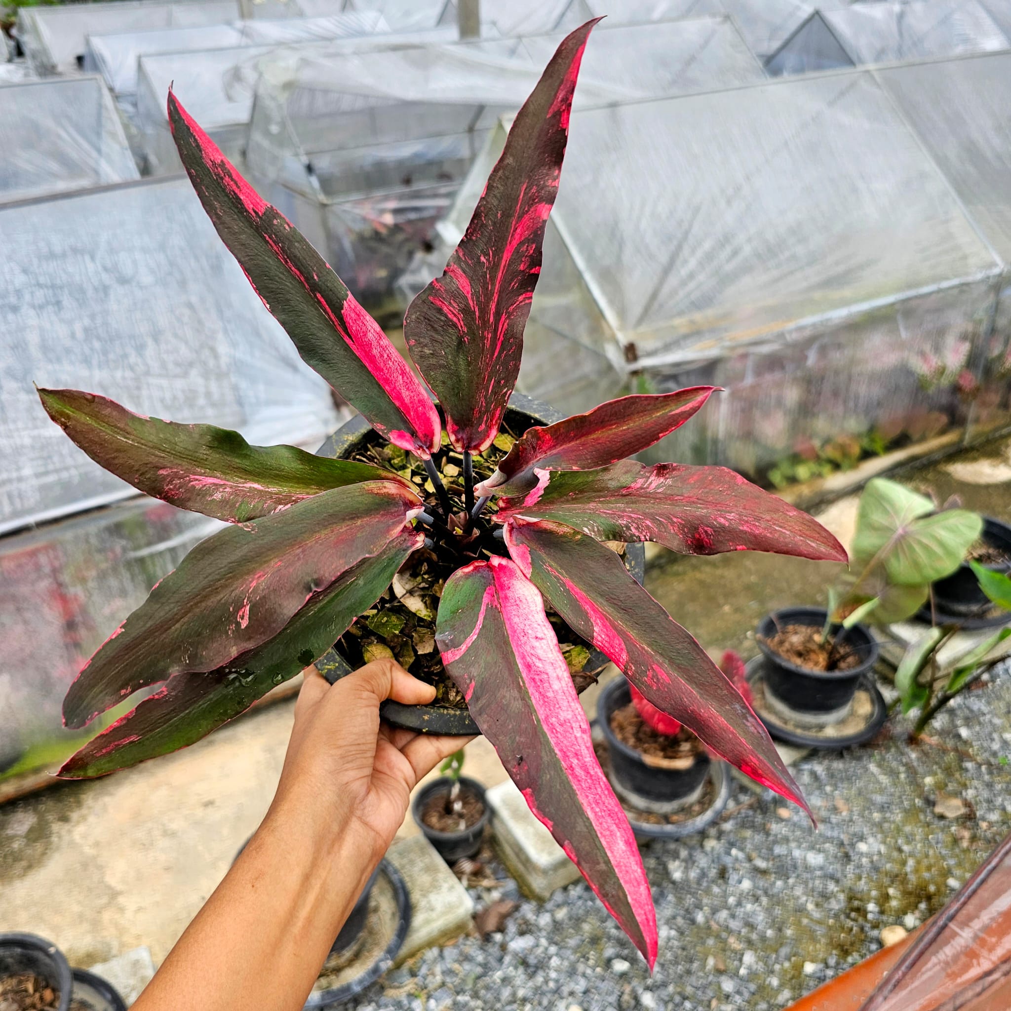 Нефритовый браслет — это утончённый каладиум с поистине ювелирной окраской. Его вытянутые листья сверкают тёмной зеленью и малиновыми мазками, будто инкрустированы драгоценными камнями. Каждый лист — как артефакт древнего Востока, венчающий руку богини или принцессы Сиама.