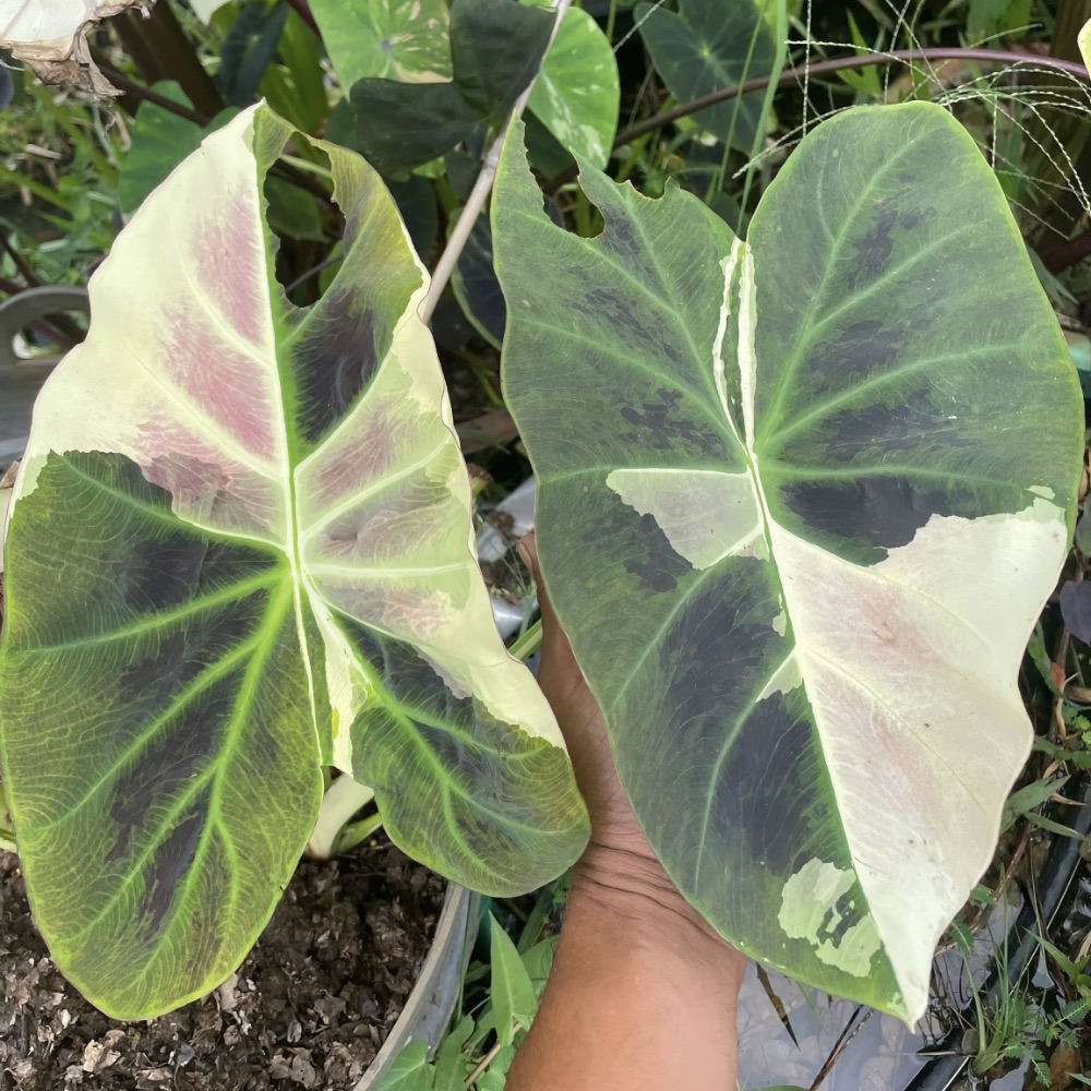 Этот сорт колоказии как раз из её мира: каждый лист уникален — то нежно-зелёный с вкраплениями розовых всполохов, то будто вырезанный из полупрозрачного света.