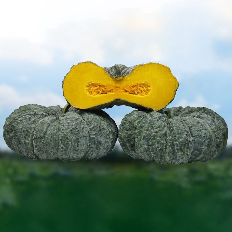 🍈 Плоды округлые и приплюснутые, тёмно-зелёные, с характерной морщинистой поверхностью. Кожура плотная и прочная. Мякоть — насыщенно-жёлтая, толстая и мясистая. При разрезании видно, что семенная камера небольшая, что увеличивает выход полезной мякоти.