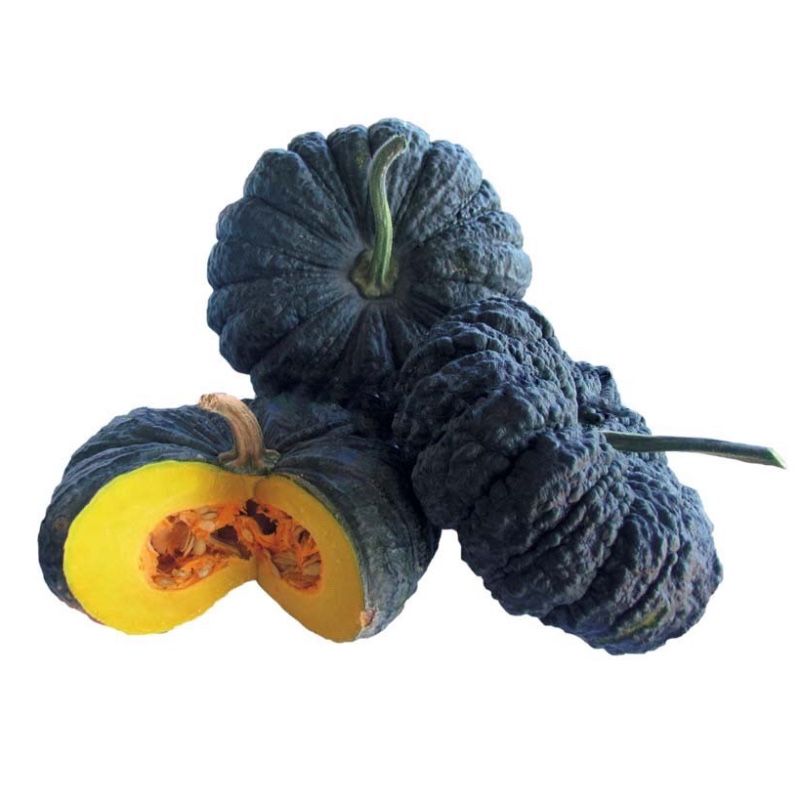 🍈 Форма плода округлая и слегка приплюснутая. Кожура тёмно-зелёная, почти чёрная, с морщинистой поверхностью. Внутри — ярко-жёлтая мякоть с насыщенным цветом и плотной структурой. При разрезании хорошо видны плотные волокна и мелкая семенная камера.