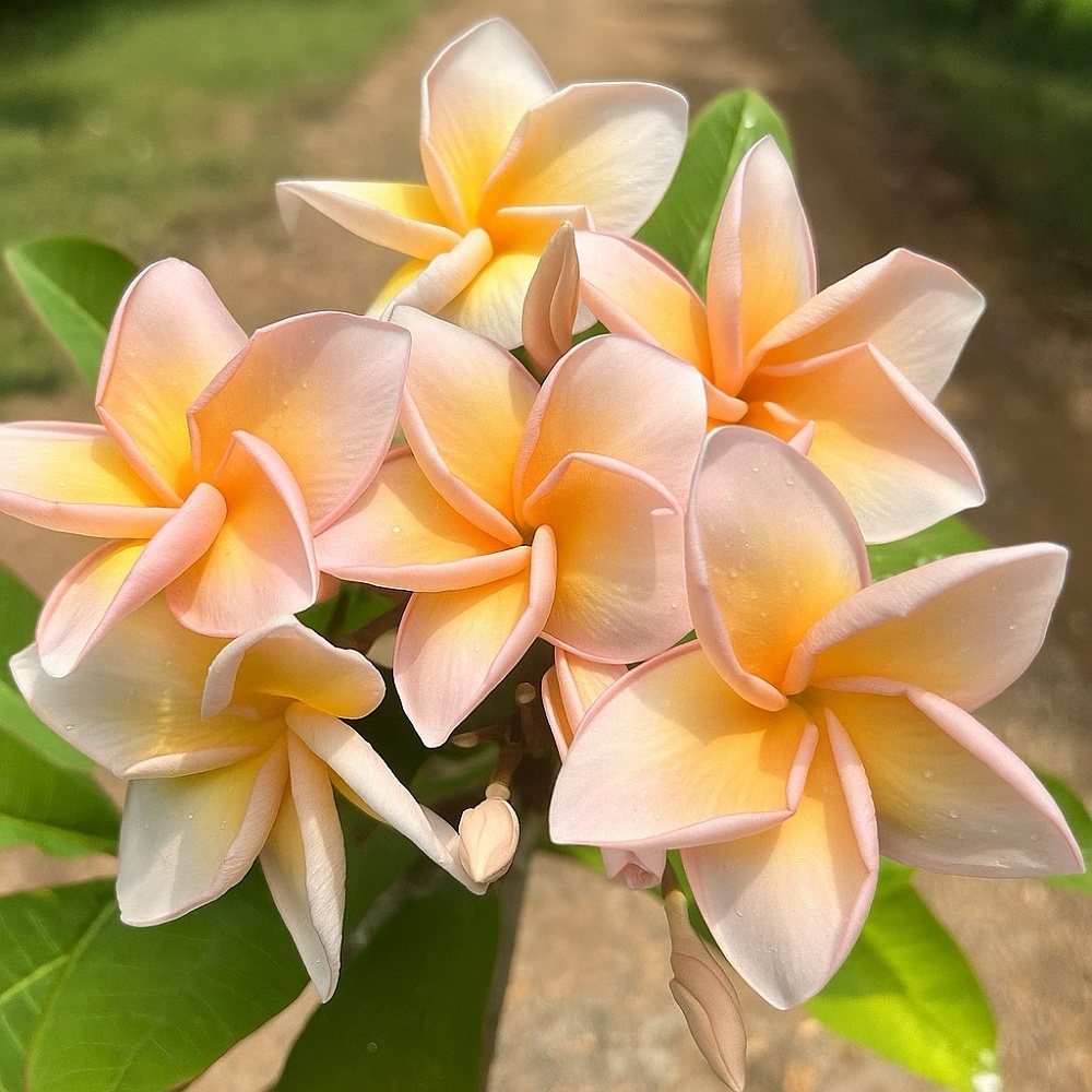 Когда солнце ещё спит за холмами, и первые лучи осторожно касаются земли, где-то в тропическом саду распускается Гроздь света — плюмерия, рождённая из дыхания зари.