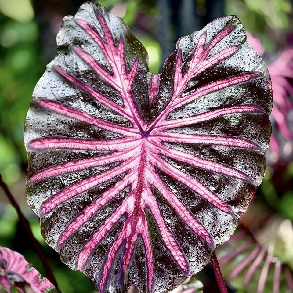 В тропическом саду есть один властелин — и это он. ‘Король’ царит без слов: его густо-бордовая листва отливает чёрным бархатом, а яркие малиновые жилки пронизывают лист, словно королевская вышивка на мантии древнего правителя ✨.